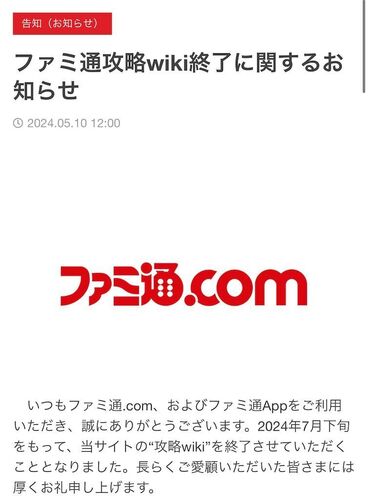 ガチでビックリした〜!! まさかのファミ通攻略wikiが終了! この中に白猫プロジェクト入ってたのでマジで公式攻略サイトは消えますね…一応7月下旬終了なので10周年は見届けられる。 ちなみに他のゲームタイトルも並んでたので白猫が大規模アプデで手に負え…